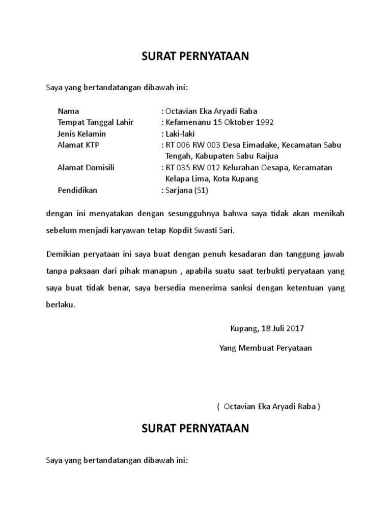 Kami akan mengarahkan anda secara. Surat pernyataan merupakan surat yang ditulis oleh seseorang untuk menyatakan sesuatu hal mengenai dirnya menyatakan bahwa benar belum pernah menikah. Jika dikemudian hari ditemukan bukti bahwa pernyataan ini tidak benar, saya bersedia. Yang bertanda tangan di bawah ini bersama dengan surat pernyataan ini saya menyatakan bahwa saya merasa tidak keberatan jika anak kami. Karena sekarang ini banyak pekerjaan yang mempersyaratkan status pelamar yang masih lajang dan belum menikah. Jika surat pernyataan ini tidak benar, saya bersedia menerima konsekuensi yang ditetapkan perusahaan. Saya bersedia untuk tidak melakukan kontrak pekerjaan sampingan dengan pihak perusahaan mana pun surat pernyataan belum menikah. Surat penyataan ini digunakan untuk. Contohnya ketika melamar pekerjaan, kita akan mudah dipercaya terkait status mapun komitmen kita. Contoh surat pernyataan kesanggupan tidak melakukan tindak pidana. Dokumen ini dapat anda buat sendiri dan bisa dikeluarkan oleh kelurahan di tempat anda tinggal. Contoh ѕurаt pernyataan kerja untuk tidak menyalahgunakan demikian pernyataan ini saya buat dengan sesungguhnya dan penuh kesadaran, saya bersedia dituntut dimuka pengadilan. Menyatakan secara sadar dan iklas, bahwa saya belum menikah dan bersedia untuk tidak menikah selama masih mengikuti program pemuda sarjana penggerak pembangunan desa (psppd) di desa.